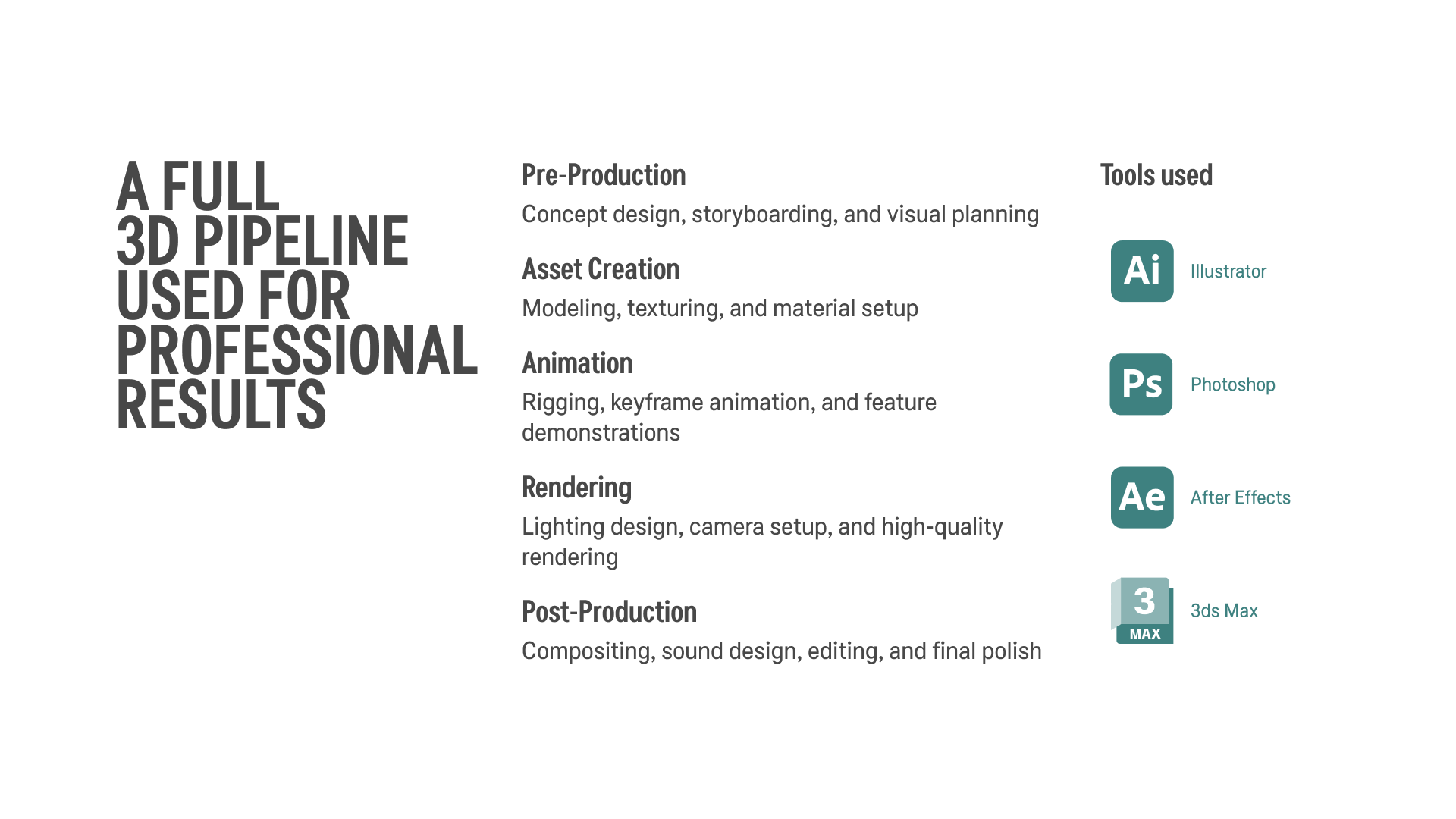 - 3D and 2D rendering and animation (from ideation through storyboard to final cut)
